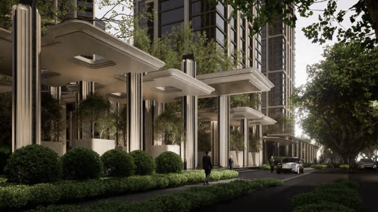 美学立面,中段以浪白与落日金游艇舱勾勒出270°江景画框,下段石材柱廊则向上生长出ART-DECO经典线条。