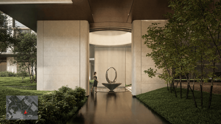 整个社区的景象,也不再是扁平的,架空层与约3500㎡下沉式艺术院子,构成了约13米的凹凸差,景象的立体浸透,构成崎岖连绵的坡地,散步社区,犹如游园。